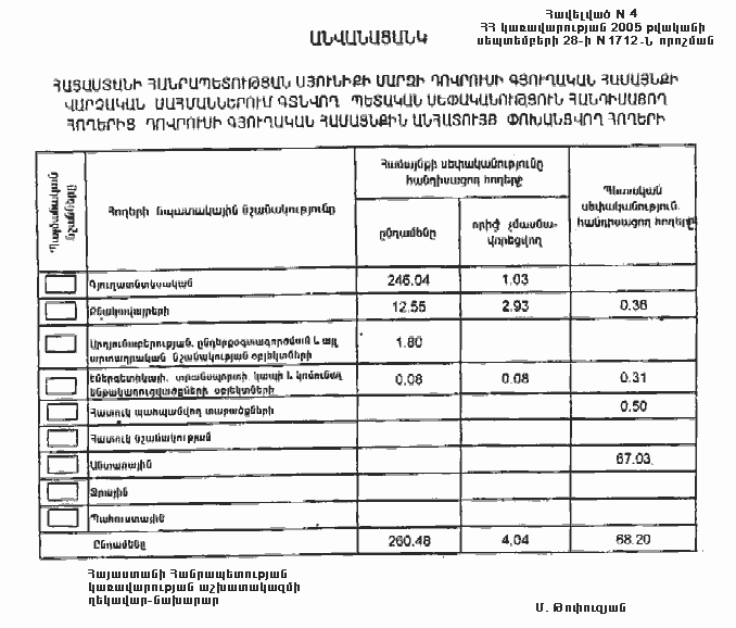 4. Ընդունել ի գիտություն Հայաստանի Հանրապետության Սյունիքի մարզի Դովրուսի գյուղական համայնքի հողային ֆոնդի առկայության և բաշխման մասին հաշվետվությունը` 2005 թվականի հունվարի 1-ի դրությամբ` համաձայն NN 8 և 9 հավելվածների: