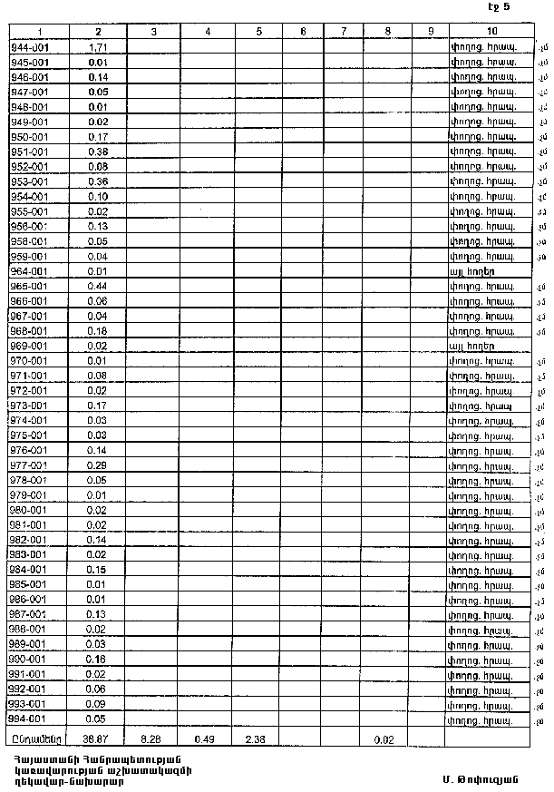 4. Ընդունել ի գիտություն Հայաստանի Հանրապետության Տավուշի մարզի Ոսկեպարի գյուղական համայնքի հողային ֆոնդի առկայության և բաշխման մասին հաշվետվությունը՝ 2005 թվականի հունվարի 1-ի դրությամբ՝ համաձայն NN 8 և 9 հավելվածների: