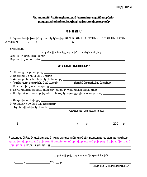 ՕԴԱՆԱՎԻ ԹՌԻՉՔԻ ԹՈՒՅԼՏՎՈՒԹՅՈՒՆ 1. գրանցման նիշերը Nationality and registration marks .................................... 2 օդանավի նշագրումը Manufacturer, manufacturer's designation of aircraft ........................................................................................ ........................................................................................ 3. սերիայի համարը Aircraft serial number .................................... 4. Թույլտվության բովանդակությունը .................................................................................................................. ................................................................................................................................................................................... The permit covers .................................................................................................................................................. ................................................................................................................................................................................... 5. Սահմանափակումներ/Նշումներ Limitation/ Remarks Սույնով ՀՀ կառավարությանն առընթեր քաղաքացիական ավիացիայի գլխավոր վարչությունը ՔԱԳՎ պետի 2004 թվականի դեկտեմբերի 9-ի N 192-Ն հրամանի համաձայն թույլ է տալիս տվյալ ինքնաթիռի ներքոհիշյալ հատուկ պայմաններով թռիչքը ՀՀ օդային տարածքում: Սույն թույլտվությունը գործում է նաև այլ երկրների օդային տարածքներում թռիչքներ իրականացնելու նպատակով՝ տվյալ երկրների համապատասխան մարմինների կողմից լրացուցիչ թույլտվության առկայության պայմանով: The General department of civil aviation at the government of the Republic of Armenia granted by virtue of the Order No. 192-Ն hereby permit noted aircraft to fly within the airspace of the Republic of Armenia. This permit is also valid for flight within other States provided separate approval is obtained from the competent authorities of such States. Թռիչքների անվտանգության տեսչական վարչության պետ Director Flight Safety Inspection Department ........................................................................... (Ստորագրություն, Ազգանուն) (Signature, Name)