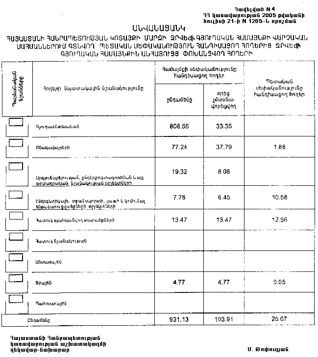 4. Ընդունել ի գիտություն Հայաստանի Հանրապետության Կոտայքի մարզի Ջրվեժի գյուղական համայնքի հողային ֆոնդի առկայության և բաշխման մասին հաշվետվությունը՝ 2005 թվականի հունվարի 1-ի դրությամբ՝ համաձայն NN 8 և 9 հավելվածների: