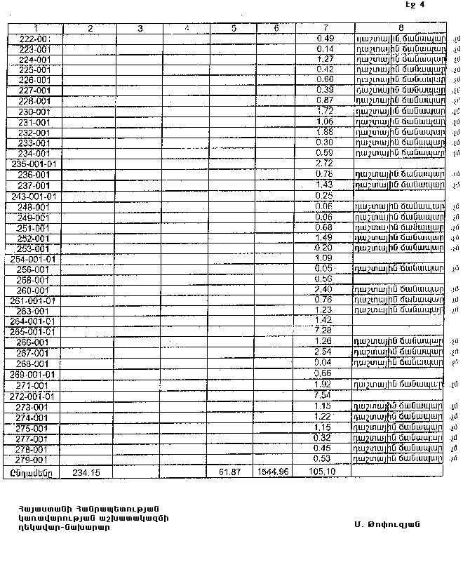 4. Ընդունել ի գիտություն Հայաստանի Հանրապետության Շիրակի մարզի Ձորաշենի գյուղական համայնքի հողային ֆոնդի առկայության և բաշխման մասին հաշվետվությունը՝ 2005 թվականի հունվարի 1-ի դրությամբ՝ համաձայն N 8 հավելվածի: