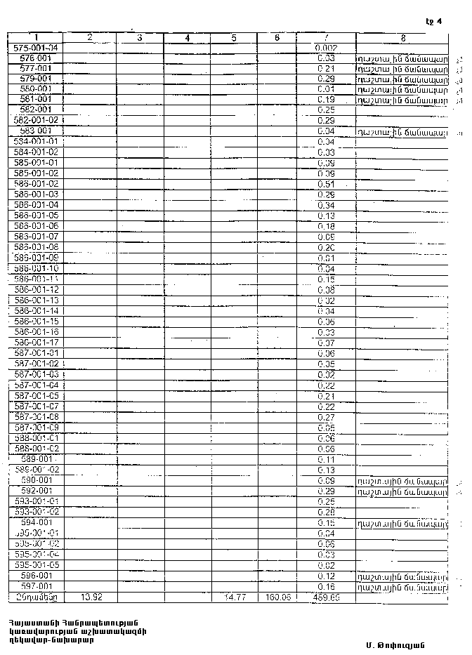4. Ընդունել ի գիտություն Հայաստանի Հանրապետության Սյունիքի մարզի Եղեգի գյուղական համայնքի հողային ֆոնդի առկայության և բաշխման մասին հաշվետվությունը՝ 2005 թվականի հունվարի 1-ի դրությամբ՝ համաձայն NN 8 և 9 հավելվածների: