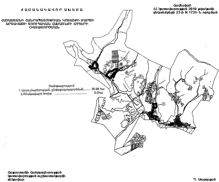 1) 36.96 հեկտար` արդյունաբերության, ընդերքօգտագործման և այլ արտադրական նշանակության օբյեկտների հողերի կատեգորիա` Հայաստանի Հանրապետության օրենսդրությամբ սահմանված կարգով՝ շշալցման գործարանի և օժանդակ կառույցների շինարարության համար, այդ թվում`