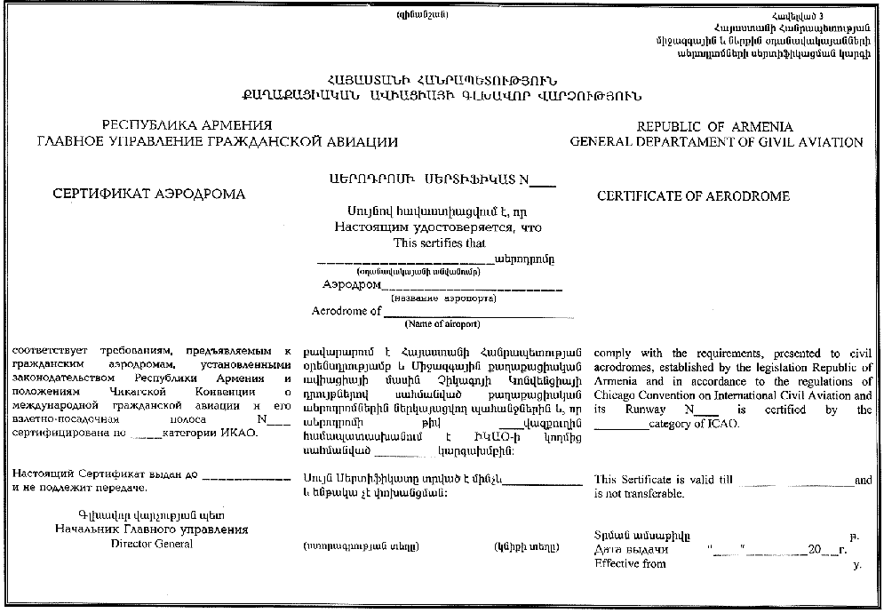 6. Հանձնաժողովի դրական եզրակացության դեպքում, Գլխավոր վարչության համապատասխան հրամանով Հայտատուին տրվում է «Աերոդրոմի Սերտիֆիկատ» (այսուհետ` Սերտիֆիկատ), համաձայն Կարգի հավելված 3-ի: