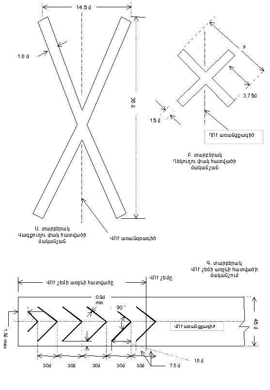 11) Եթե երկարավուն կամ իրար մոտ տեղակայված խոչընդոտները մականշվում են ցածր ինտենսիվության լույսերով, դրանց միջև հեռավորությունը կազմում է ոչ ավելի 45մ, իսկ միջին ինտենսիվության լույսերով մականշման դեպքում` 90մ: