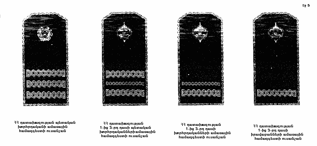 Արդարադատության 1-ին, 2-րդ և 3-րդ դասերի խորհրդականների համազգեստի ուսանշանների վերին հատվածում տեղադրվում է Հայաստանի Հանրապետության դատախազության խորհրդանիշը, ներքևի հատվածում ոսկեգույն թելերով գործվում է մեկ լայն և մեկ նեղ ժապավենատիպ հյուսվածք: