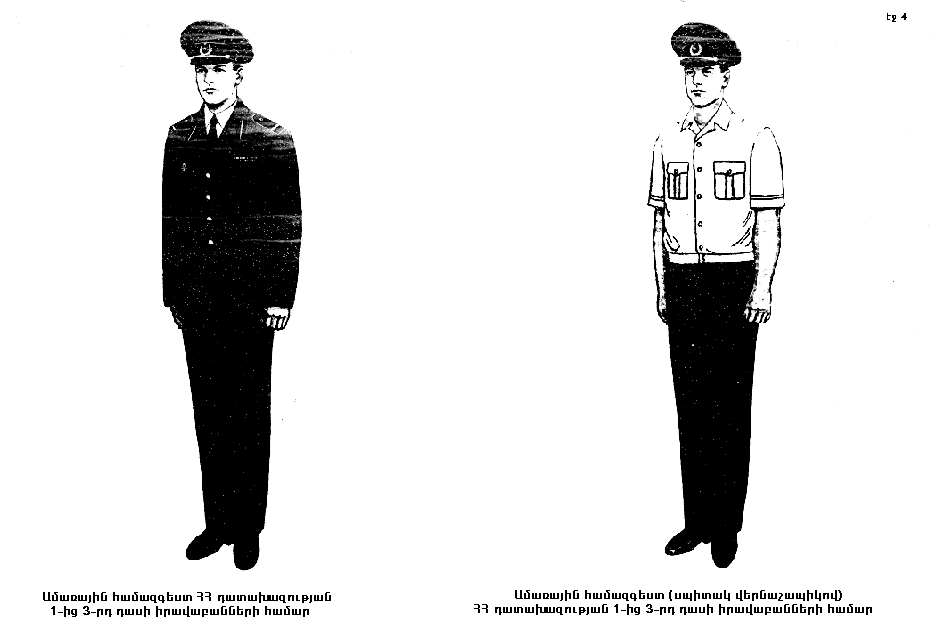 Բարձրագույն և արդարադատության 1-ին դասի խորհրդականի դասային աստիճան ունեցող աշխատողների համազգեստը մուգ կապտագույն գաբարդինից է, իսկ 2-րդ դասի իրավաբանից մինչև արդարադատության 2-րդ դասի խորհրդականի դասային աստիճան ունեցող աշխատողներինը` մուգ կապտագույն կոստյումի կտորից, օձիքը և թևքածալերը` մուգ կանաչավուն եզրաշերտով, որոնց լայնությունը 2,5 մմ է, իսկ թևքածալերի վրա կա նաև 2 փոքր կոճակ: