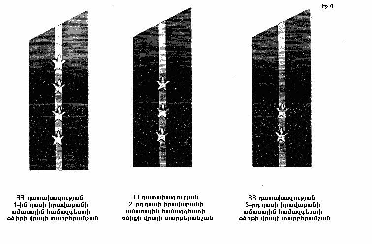 1-ին, 2-րդ և 3-րդ դասերի իրավաբանների մակակարի մակերեսն ունի մեկ մուգ դեղնավուն լուսաշերտ: 1-ին դասի իրավաբանի մակակարի մակերեսին ամրացվում է 4 ոսկեգույն հնգաթև աստղ` 13 մմ տրամագծով, 2-րդ դասի իրավաբանի մակակարի մակերեսին` 3 ոսկեգույն հնգաթև աստղ` 13 մմ տրամագծով, 3-րդ դասի իրավաբանի մակակարի մակերեսին` 2 ոսկեգույն աստղ` 13 մմ տրամագծով: