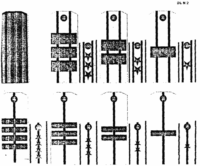 Կրտսեր լեյտենանտի, լեյտենանտի, ավագ լեյտենանտի և կապիտանի ուսադիրների վրա տեղադրվում են 10 մմ լայնքով ոսկեզօծ թելերով հյուսքաձև գործվածքի շերտեր, որոնք տեղադրվում են ուսադիրի վերին մասում ամրացված կոճակի և ստորին եզրի միջնամասում` միմյանցից 5 մմ հեռավորությամբ` ուսադիրի երկայնական առանցքային գծին ուղղահայաց`