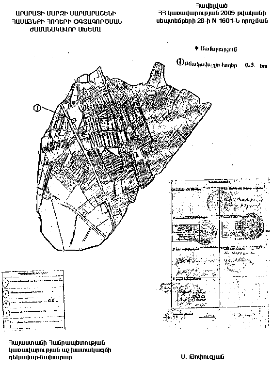 Հայաստանի Հանրապետության կառավարության 2003 թվականի նոյեմբերի 13-ի N 1489-Ն որոշմամբ հաստատված Հայաստանի Հանրապետության Արարատի մարզի Մարմարաշենի գյուղական համայնքի հողերի օգտագործման ժամանակավոր սխեմայում՝ համաձայն հավելվածի, համայնքային սեփականություն հանդիսացող գյուղատնտեսական նշանակության 0.5 հեկտար վարելահողը փոխադրել բնակավայրերի հողերի կատեգորիա` հասարակական կառուցապատման համար: