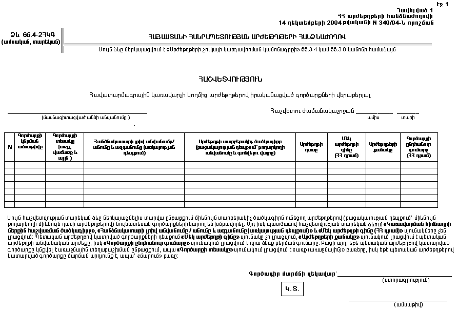 Համարելով, որ Հայաստանի Հանրապետության արժեթղթերի հանձնաժողովի 28 սեպտեմբերի 2001 թվականի ««Արժեթղթերի շուկայի կարգավորման կանոնագիրքը» հաստատելու, ՀՀ արժեթղթերի հանձնաժողովի մի շարք որոշումներ ուժը կորցրած ճանաչելու և չեղյալ համարելու մասին» թիվ 392/01 որոշմամբ հաստատված «Արժեթղթերի շուկայի կարգավորման կանոնագրքի» հավելվածի 66.4-2ՀԿԳ, 66.4-3ՀԿԳ ձևերի, ՀՀ-1, ՀՀ-2 և ՖԱ-1 աղյուսակների նոր խմբագրությամբ հաստատումը, ինչպես նաև 66.4-1ԲԳ/ԴԳ/ՀԿԳ (ամսական) և 66.4-1ԲԳ/ԴԳ/ՀԿԳ (տարեկան) նոր ձևերի սահմանումը հնարավորություն կընձեռի պարզեցնել մասնագիտացված անձանց կողմից հաշվետվությունների կազմման աշխատանքները և լիարժեք դարձնել ներկայացվող տեղեկությունների կազմը.