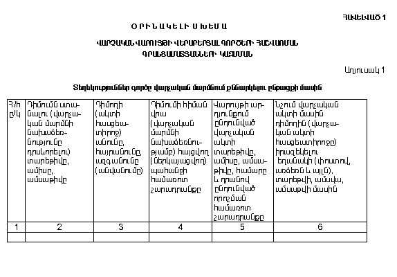 Սույն օրինակելի կարգը (այսուհետև՝ կարգ) հաստատվել է «Վարչարարության հիմունքների և վարչական վարույթի մասին» Հայաստանի Հանրապետության օրենքի (այսուհետև՝ օրենք) 28-րդ հոդվածի 2-րդ մասի պահանջներին համապատասխան:
