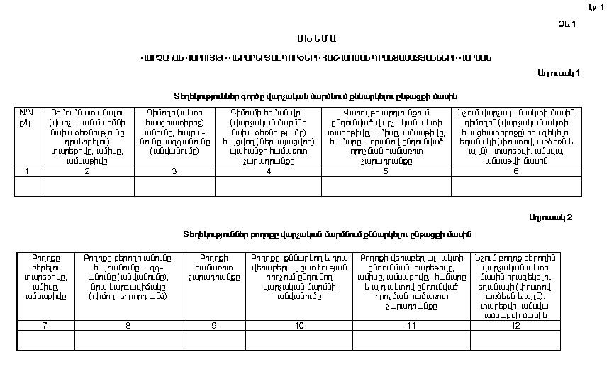 26. Հաշվառվող յուրաքանչյուր գործի մասին ամբողջական ու ամփոփ տեղեկատվություն ունենալու և դրանցից օգտվելը հեշտացնելու նպատակով` վարչական վերաբերյալ գործերի հաշվառման գրանցամատյանների յուրաքանչյուր էջ պարունակում է NN 1, 2 և 3 աղյուսակները, այդ էջերից ամեն մեկում գրանցվում են գործի վերաբերյալ տեղեկությունները` N 1 աղյուսակը` պարտադիր, բողոքի դեպքում` նաև N 2 աղյուսակը, իսկ դատարան հայց ներկայացնելու կամ բողոք բերելու դեպքում նաև N 3 աղյուսակը լրացնելով: