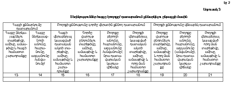 25. N 3 աղյուսակը լրացվում է միայն այն դեպքում, երբ տվյալ գործով հայց, իսկ հետագայում նաև բողոք է ներկայացվել դատարան: Այն պետք է կազմի N 2 աղյուսակի շարունակությունը, իսկ եթե բողոքը վարչական կարգով չի բերվել, ապա N 1 աղյուսակի շարունակությունը: Ընդ որում, պետք է հաշվի առնել այն հանգամանքը, որ վարչական վարույթի վերաբերյալ գործը կարող է քննվել դատական մի քանի ատյաններում: Այդ պատճառով նպատակահարմար է N 3 աղյուսակը բաժանել 3 հավասար մասի՝ յուրաքանչյուրում նշելով`