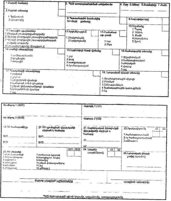 33. Անհրաժեշտության դեպքում, եթե ՃՏՊ-ի մասնակիցների (քաղաքացիներ, տրանսպորտային միջոցներ) թիվը ավելի է քարտում՝ տվյալների լրացման համար նախատեսված տողերից, ապա կարող են նույն համարով լրացվել 2 և ավելի քարտեր: