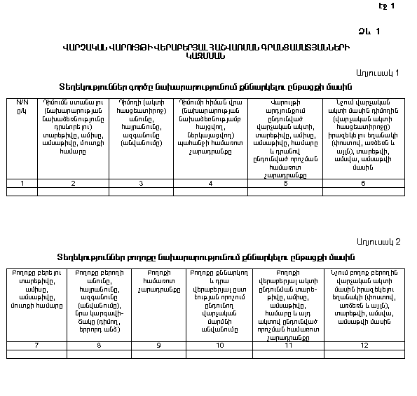 26. Հաշվառվող յուրաքանչյուր գործի մասին ամբողջական ու ամփոփ տեղեկատվություն ունենալու և դրանցից օգտվելը հեշտացնելու նպատակով` վարչական վարույթի վերաբերյալ գործերի հաշվառման գրանցամատյանների յուրաքանչյուր էջ պարունակում է NN 1, 2 և 3 աղյուսակները, այդ էջերից ամեն մեկում գրանցվում են գործի վերաբերյալ տեղեկությունները` N 1 աղյուսակը` պարտադիր, բողոքի դեպքում` նաև N 2 աղյուսակը, իսկ դատարան հայց ներկայացնելու կամ բողոք բերելու դեպքում` նաև N 3 աղյուսակը լրացնելով: