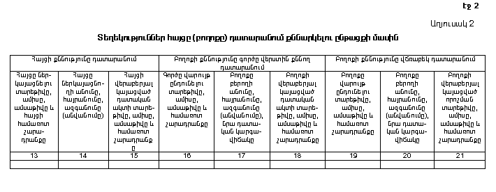23. N 2 աղյուսակը լրացվում է միայն այն դեպքում, երբ տվյալ գործով բողոք է բերվել, և այն, օրենքին համապատասխան, քննարկվել և դրա վերաբերյալ ըստ էության որոշում է ընդունվել: