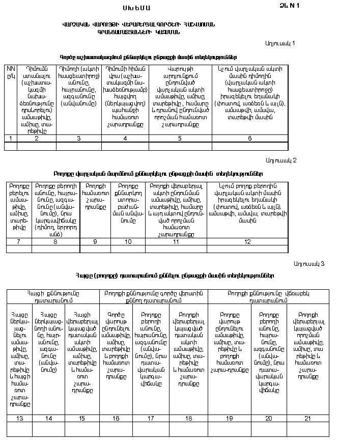 ՀԱՅԱՍՏԱՆԻ ՀԱՆՐԱՊԵՏՈՒԹՅԱՆ ԿԱՌԱՎԱՐՈՒԹՅԱՆ ԱՇԽԱՏԱԿԱԶՄՈՒՄ ՀԱՐՈՒՑՎՈՂ ՎԱՐՉԱԿԱՆ ՎԱՐՈՒՅԹԻ ՎԵՐԱԲԵՐՅԱԼ ԳՈՐԾԵՐԻ, ԴՐԱՆՑ ՀԱՇՎԱՌՄԱՆ ԳՐԱՆՑԱՄԱՏՅԱՆՆԵՐԻ ԵՎ ՎԱՐՉԱԿԱՆ ԱԿՏԵՐԻ ՀԱՇՎԱՌՄԱՆ ԳՐԱՆՑԱՄԱՏՅԱՆՆԵՐԻ ՎԱՐՄԱՆ ԿԱՐԳՆ ՈՒ ՊԱՅՄԱՆՆԵՐԸ