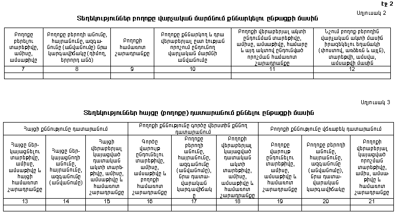 գ) N 3 աղյուսակում նշում են տվյալ գործով դատարան ներկայացված հայցի, դատարան բերված բողոքի քննարկման և դրանց վերաբերյալ ըստ էության որոշում կայացնելու մասին տեղեկությունները։