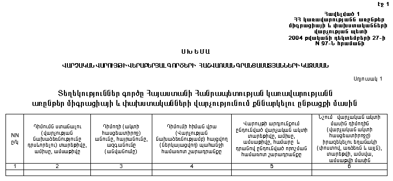ՀԱՅԱՍՏԱՆԻ ՀԱՆՐԱՊԵՏՈՒԹՅԱՆ ԿԱՌԱՎԱՐՈՒԹՅԱՆՆ ԱՌԸՆԹԵՐ ՄԻԳՐԱՑԻԱՅԻ ԵՎ ՓԱԽՍՏԱԿԱՆՆԵՐԻ ՎԱՐՉՈՒԹՅՈՒՆՈՒՄ ՎԱՐՉԱԿԱՆ ՎԱՐՈՒՅԹԻ ՎԵՐԱԲԵՐՅԱԼ ԳՈՐԾԵՐԻ, ԴՐԱՆՑ ՀԱՇՎԱՌՄԱՆ ԳՐԱՆՑԱՄԱՏՅԱՆՆԵՐԻ ԵՎ ՎԱՐՉԱԿԱՆ ԱԿՏԵՐԻ ՀԱՇՎԱՌՄԱՆ ԳՐԱՆՑԱՄԱՏՅԱՆՆԵՐԻ ՎԱՐՄԱՆ