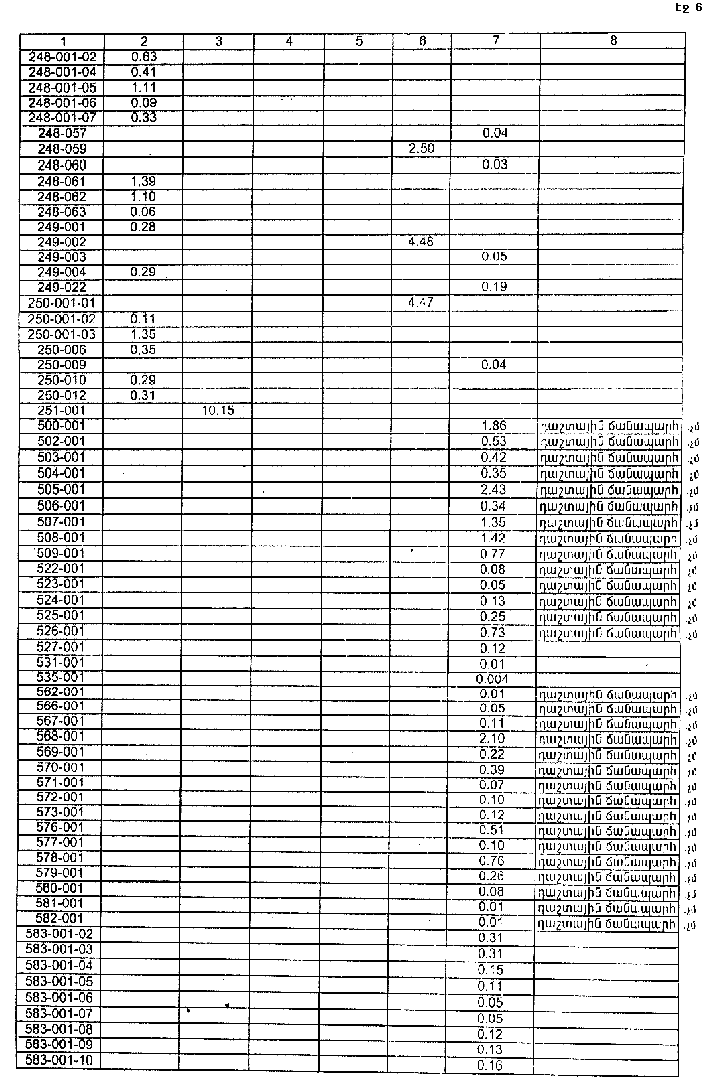 6. Թույլատրել Հայաստանի Հանրապետության կառավարությանն առընթեր անշարժ գույքի կադաստրի պետական կոմիտեի նախագահին Հայաստանի Հանրապետության պետական գեոդեզիական ցանցի հավասարակշռման արդյունքների հիման վրա Հայաստանի Հանրապետության վարչատարածքային միավորների սահմանանիշերի կոորդինատների ժողովածուի հրատարակումից հետո հողային ֆոնդի ընթացիկ հաշվառման ժամանակ Հայաստանի Հանրապետության Սյունիքի մարզի Դարբասի գյուղական համայնքի հողային հաշվեկշռում սահմանված կարգով կատարել համապատասխան փոփոխություններ: