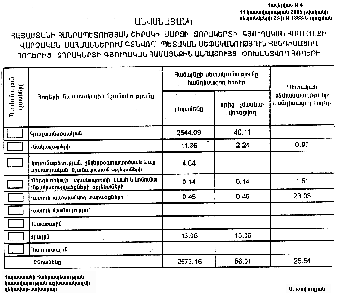 ա) Հայաստանի Հանրապետության Շիրակի մարզի Զորակերտի գյուղական համայնքին անհատույց սեփականության իրավունքով փոխանցվող 2573.16 հեկտար հողերից 56.01 հեկտարը մասնավորեցման ենթակա չէ.