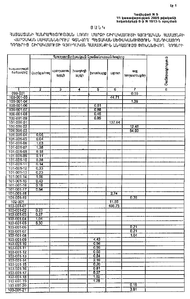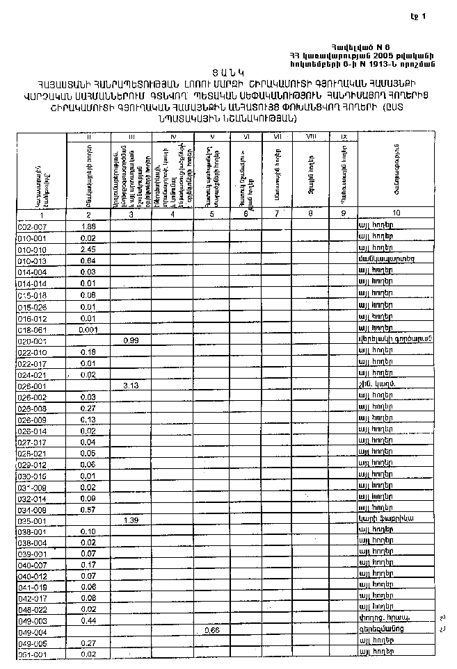 ՀԱՅԱՍՏԱՆԻ ՀԱՆՐԱՊԵՏՈՒԹՅԱՆ ԼՈՌՈՒ ՄԱՐԶԻ ՇԻՐԱԿԱՄՈՒՏԻ ԳՅՈՒՂԱԿԱՆ ՀԱՄԱՅՆՔԻ ՎԱՐՉԱԿԱՆ ՍԱՀՄԱՆՆԵՐՈՒՄ ԳՏՆՎՈՂ` ՊԵՏԱԿԱՆ ՍԵՓԱԿԱՆՈՒԹՅՈՒՆ ՀԱՆԴԻՍԱՑՈՂ ՀՈՂԵՐԻՑ ՇԻՐԱԿԱՄՈՒՏԻ ԳՅՈՒՂԱԿԱՆ ՀԱՄԱՅՆՔԻՆ ԱՆՀԱՏՈՒՅՑ ՓՈԽԱՆՑՎՈՂ ՀՈՂԵՐԻ (ԸՍՏ ՆՊԱՏԱԿԱՅԻՆ ՆՇԱՆԱԿՈՒԹՅԱՆ) | |