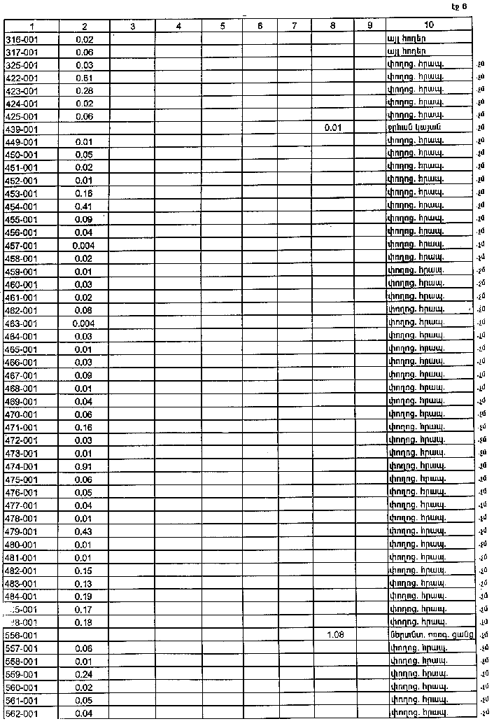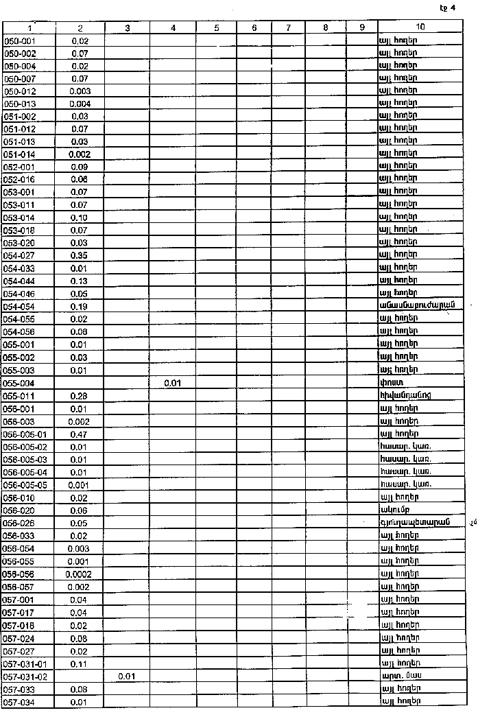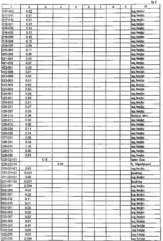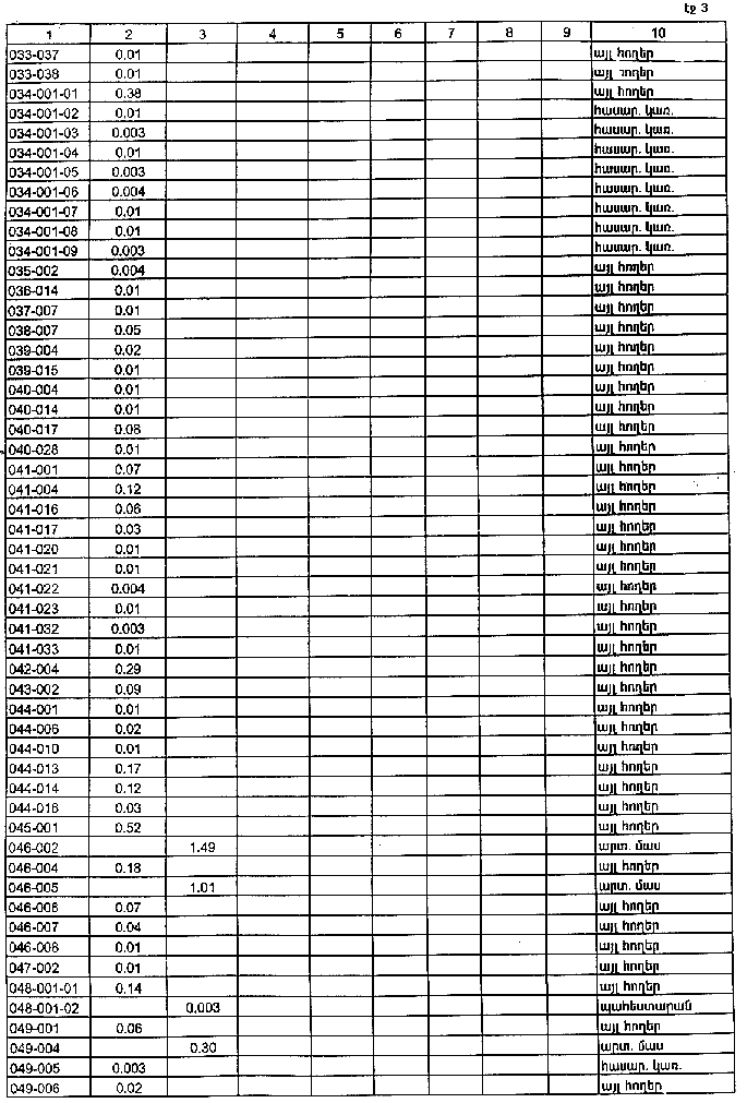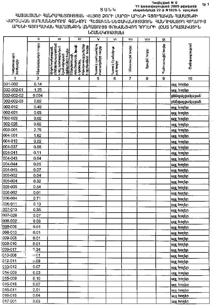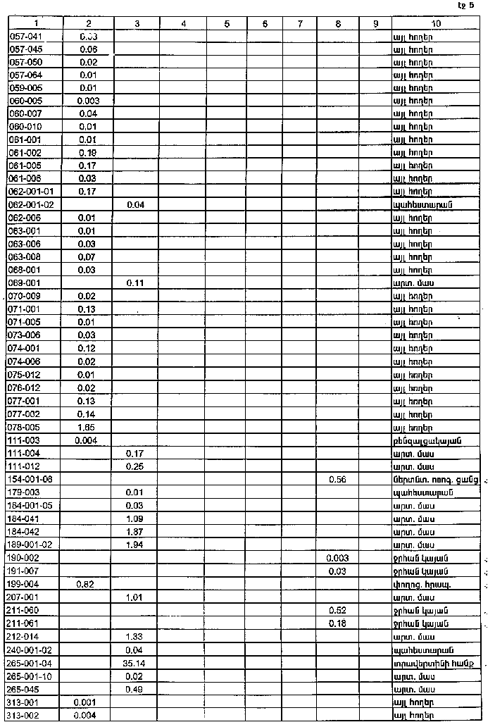 Կադաստրային II III IV V VI VII VIII IX Ծանոթա- Բնակա- Արդյունա- Էներգետիկայի, Հատուկ պահ- Հատուկ նշանա- Անտա- Ջրային Պահուս- 1 2 3 4 5 6 7 8 9 10 046-001 0.24 հատուկ նշ. հողեր 059-008 1.13 դպրոց 179-001-02 2.68 արգելավայր 184-001-02 0.76 դամբարանադաշտ 184-001-03 2.76 արգելավայր 184-001-04 5.23 դամբարանադաշտ 184-001-06 2.00 դամբարանադաշտ 184-013 2.18 գերեզմանոց 184-044 26.43 արգելավայր 184-045 25.39 արգելավայր 184-046 12.42 արգելավայր 189-001-01 5.51 դամբարանադաշտ 189-003 0.47 գերեզմանոց 191-001 1.68 ջրհան կայան 265-001-05 2.53 դամբարանադաշտ 265-001-09 0.24 դամբարանադաշտ 265-043 0.79 ջրհան կայան 265-050 2.99 ջրհան կայան 329-001 84.72 արգելավայր 426-001 0.01 մարզ. նշ. ճանապ. 427-001 1.94 միջպետական 432-001 0.54 մարզ. նշ. ճանապ. 433-001 0.42 գետ 504-001 0.65 ջրանցք 515-001 1.61 մարզ. նշ. ճանապ. 563-001 23.14 գետ 600-001 3.09 միջպետական 703-001 10.24 գետ 714-001 3.01 միջպետական 736-001 0.27 ջրանցք 739-001 4.05 մարզ. նշ. ճանապ 740-001 4.18 գետ 745-001 0.78 մարզ. նշ. ճանապ Ընդամենը 1.13 15.03 173.32 0.24 44.36