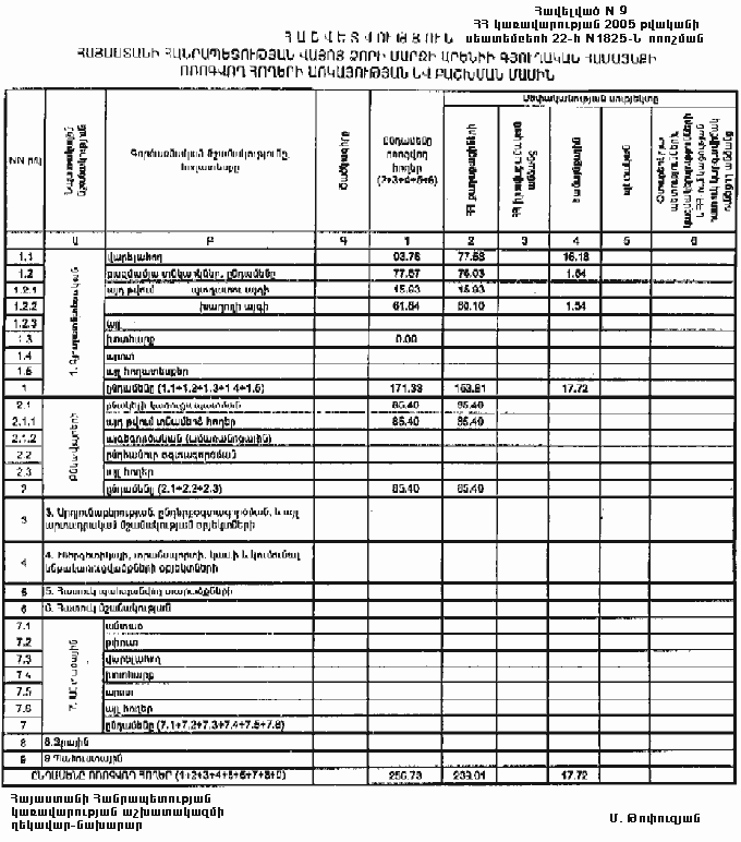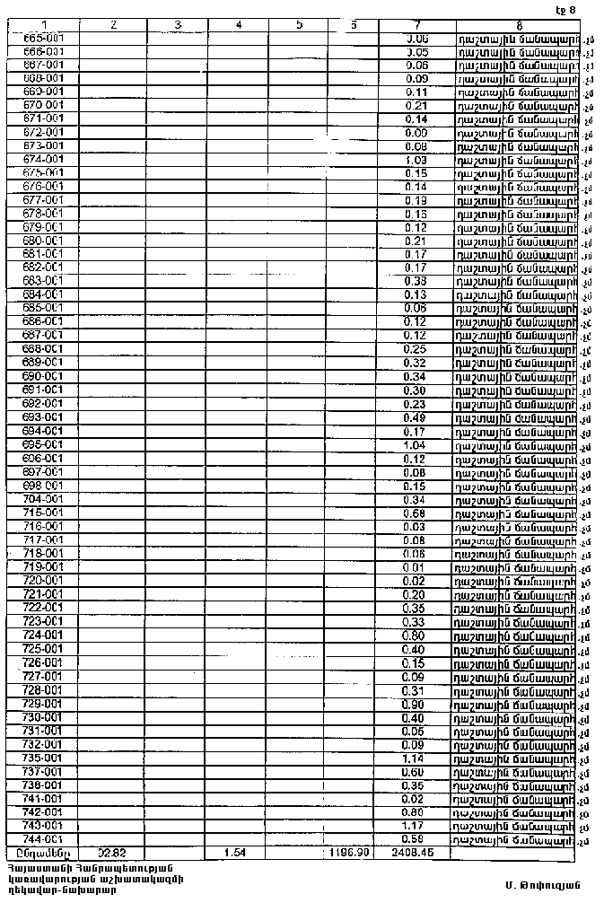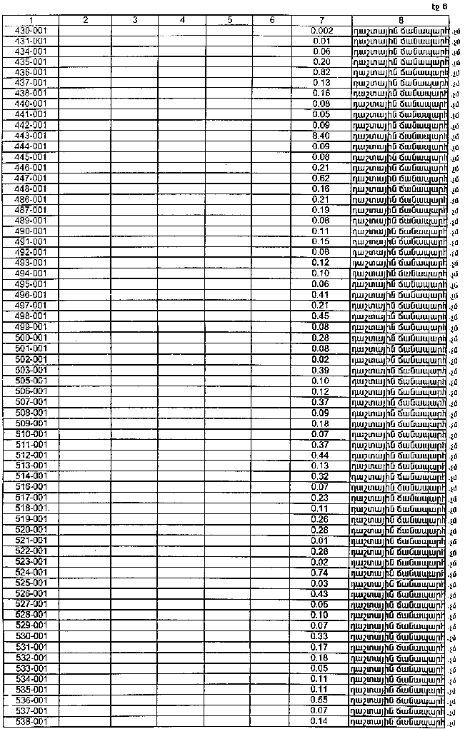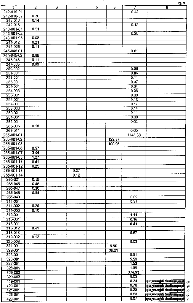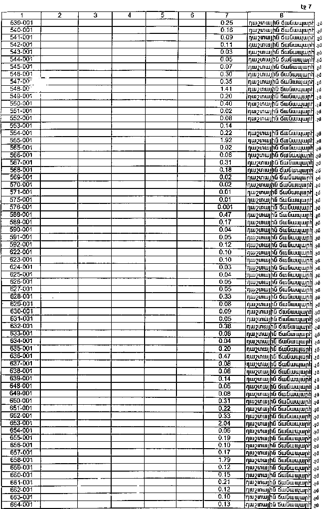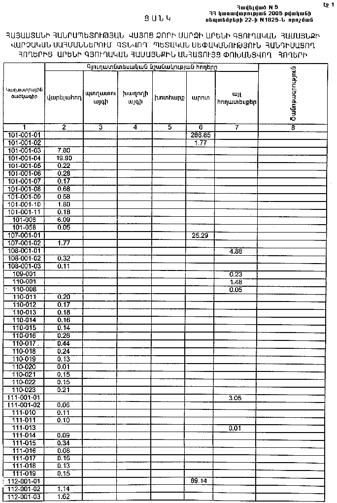 Կադաստրային II III IV V VI VII VIII IX Ծանոթա- Բնակա- Արդյունա- Էներգետիկայի, Հատուկ պահ- Հատուկ նշանա- Անտա- Ջրային Պահուս- 1 2 3 4 5 6 7 8 9 10 046-001 0.24 հատուկ նշ. հողեր 059-008 1.13 դպրոց 179-001-02 2.68 արգելավայր 184-001-02 0.76 դամբարանադաշտ 184-001-03 2.76 արգելավայր 184-001-04 5.23 դամբարանադաշտ 184-001-06 2.00 դամբարանադաշտ 184-013 2.18 գերեզմանոց 184-044 26.43 արգելավայր 184-045 25.39 արգելավայր 184-046 12.42 արգելավայր 189-001-01 5.51 դամբարանադաշտ 189-003 0.47 գերեզմանոց 191-001 1.68 ջրհան կայան 265-001-05 2.53 դամբարանադաշտ 265-001-09 0.24 դամբարանադաշտ 265-043 0.79 ջրհան կայան 265-050 2.99 ջրհան կայան 329-001 84.72 արգելավայր 426-001 0.01 մարզ. նշ. ճանապ. 427-001 1.94 միջպետական 432-001 0.54 մարզ. նշ. ճանապ. 433-001 0.42 գետ 504-001 0.65 ջրանցք 515-001 1.61 մարզ. նշ. ճանապ. 563-001 23.14 գետ 600-001 3.09 միջպետական 703-001 10.24 գետ 714-001 3.01 միջպետական 736-001 0.27 ջրանցք 739-001 4.05 մարզ. նշ. ճանապ 740-001 4.18 գետ 745-001 0.78 մարզ. նշ. ճանապ Ընդամենը 1.13 15.03 173.32 0.24 44.36