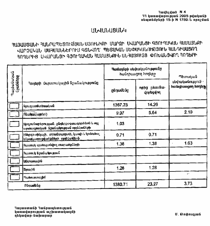 4. Ընդունել ի գիտություն Հայաստանի Հանրապետության Սյունիքի մարզի Սվարանցի գյուղական համայնքի հողային ֆոնդի առկայության և բաշխման մասին հաշվետվությունը` 2005 թվականի հունվարի 1-ի դրությամբ` համաձայն NN 8 և 9 հավելվածների: