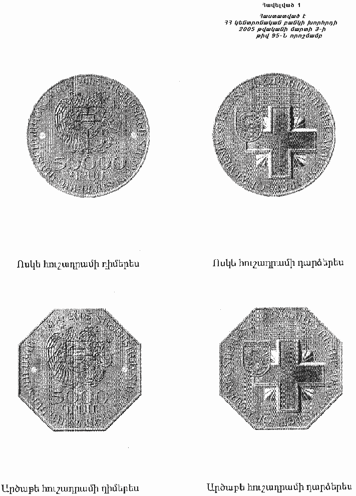 1. Հաստատել 2004-2005 թվականների ծրագրով նախատեսված «Հայաստանի Հանրապետության զինված ուժեր» մեկ արծաթե և մեկ ոսկե հուշադրամների ուրվագծերը՝ ըստ հավելված 1-ի (կցվում է)։