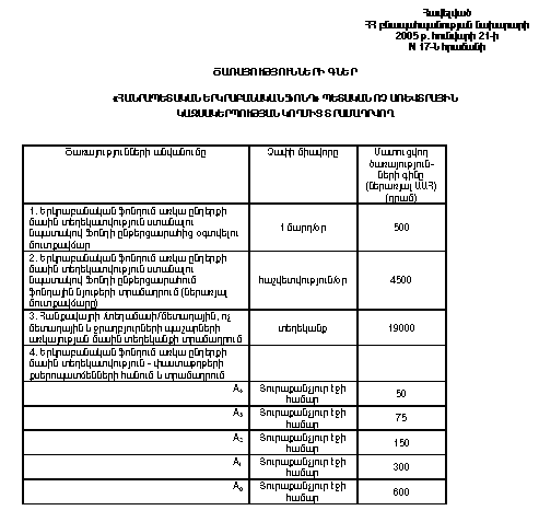Հաստատել Հայաստանի Հանրապետության ֆինանսների և էկոնոմիկայի նախարարության հետ համաձայնեցված (07.01. 2005 թ. N 4/4-Ե-2-26 գրություն) «Հանրապետական երկրաբանական ֆոնդ» պետական ոչ առևտրային կազմակերպության կողմից տրամադրվող ծառայությունների գները համաձայն հավելվածի: