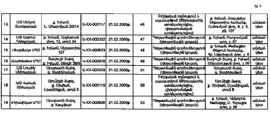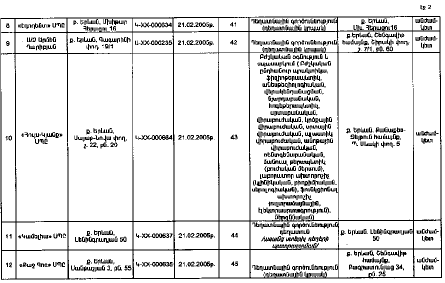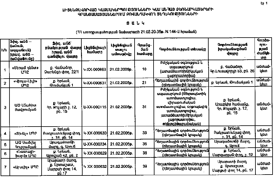 ԼԻՑԵՆԶԱՎՈՐՎԱԾ ԿԱԶՄԱԿԵՐՊՈՒԹՅՈՒՆՆԵՐԻ ԿԱՄ ԱՆՀԱՏ ՁԵՌՆԱՐԿԱՏԵՐԵՐԻ ԳՐԱՆՑԱՄԱՏՅԱՆՆԵՐՈՒՄ ԲՈՎԱՆԴԱԿՎՈՂ ՏԵՂԵԿՈՒԹՅՈՒՆՆԵՐԻ ՑԱՆԿ