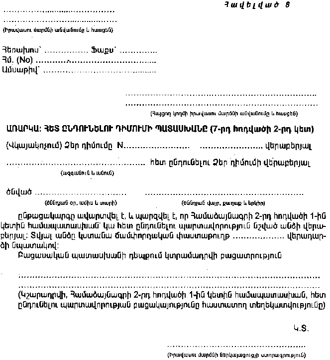 8. Դիմումի պատասխան նշանակում է՝ ծանուցում, որով հայցվող Կողմը պատասխանում է հետ ընդունելու կամ տարանցման վերաբերյալ դիմումին: