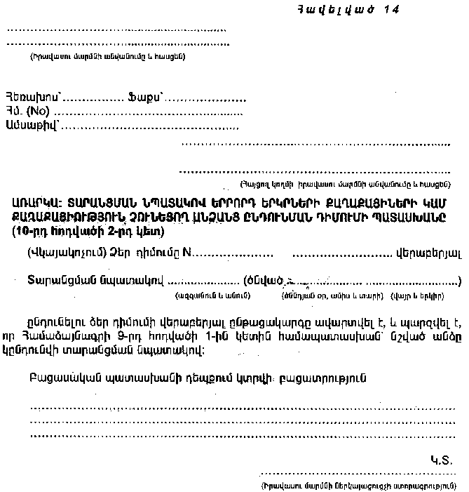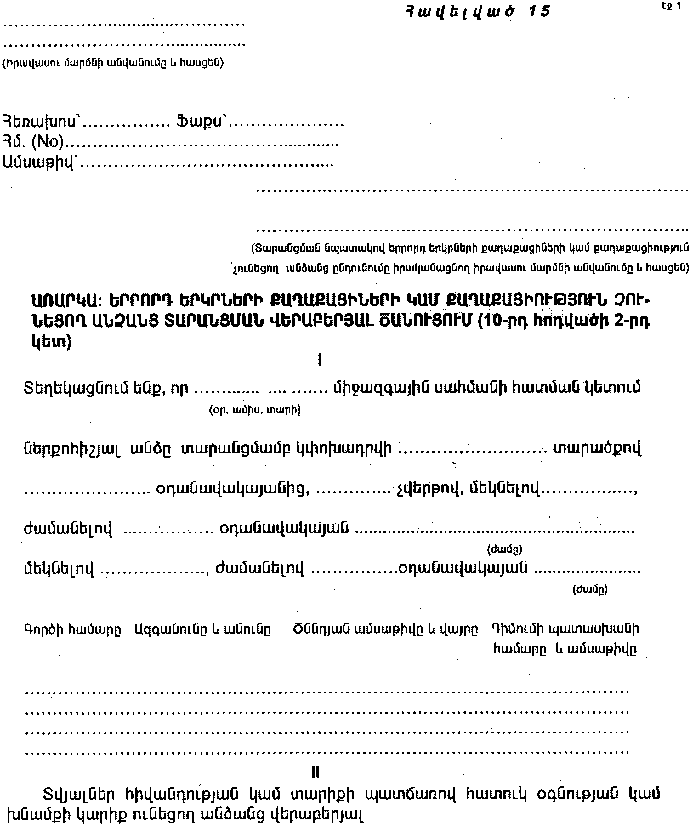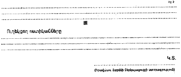 - անձը հաստատող փաստաթղթին կամ անձնագրին (համար, վավերականության ժամկետ, տալու ամսաթիվ, տվող մարմին, տալու վայր),