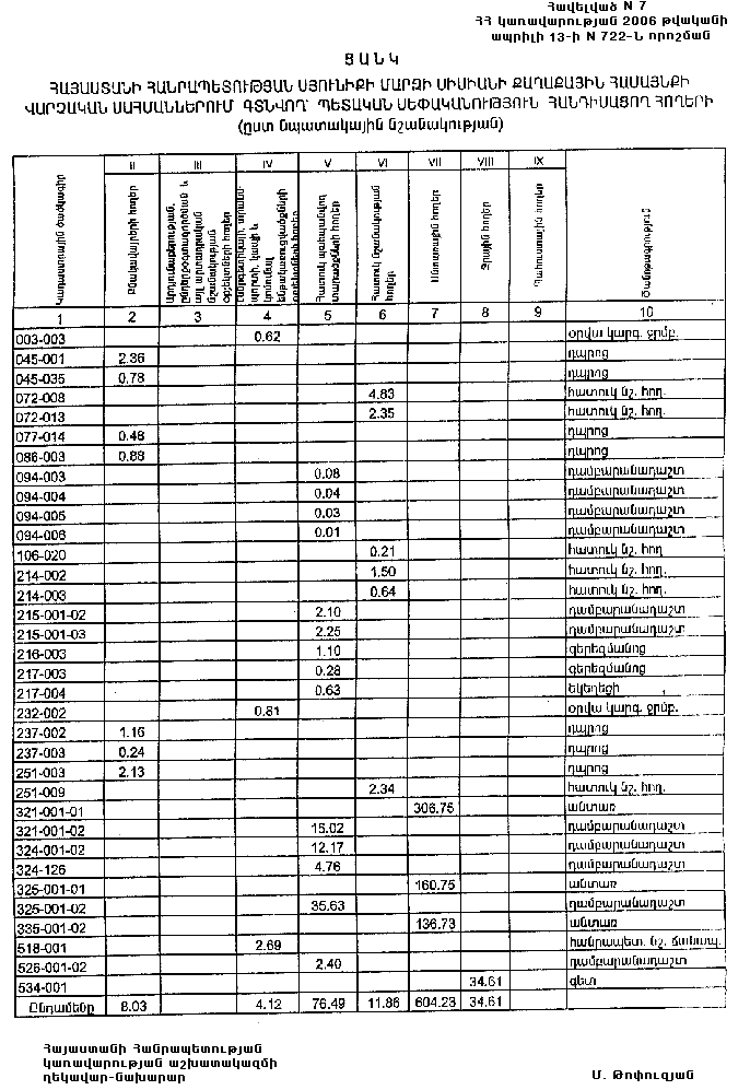 7. Հայաստանի Հանրապետության Սյունիքի մարզպետին` Հայաստանի Հանրապետության կառավարության 2000 թվականի հոկտեմբերի 23-ի N 656 որոշմամբ սահմանված կարգով` սկզբնական հաշվառման տվյալների հիման վրա ապահովել մարզի տարածքում ընթացիկ հաշվառման աշխատանքների իրականացումը: