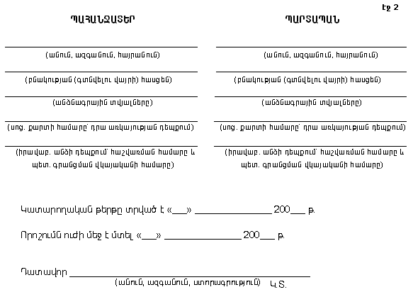 1. Օրինական ուժի մեջ մտած դատական ակտի հիման վրա կատարողական թերթը տրվում է պահանջատիրոջը` նրա դիմումի հիման վրա: