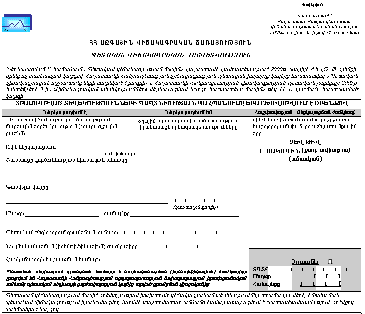 «ՕԴԱՅԻՆ ՏՐԱՆՍՊՈՐՏՈՎ ԲԵՌՆԵՐԻ ՓՈԽԱԴՐՄԱՆ ՍԱԿԱԳՆԵՐԻ ՄԱՍԻՆ» ՁԵՎ ԹԻՎ 1-ՍԱԿԱԳԻՆ (ՔԱՂ. ԱՎԻԱՑԻԱ) (ԱՄՍԱԿԱՆ) ՊԵՏԱԿԱՆ ՎԻՃԱԿԱԳՐԱԿԱՆ ԴԻՏԱՐԿՄԱՆ ՀԱՐՑԱԹԵՐԹԸ ԵՎ ԼՐԱՑՄԱՆ ՑՈՒՑՈՒՄԸ ՀԱՍՏԱՏԵԼՈՒ ՄԱՍԻՆ