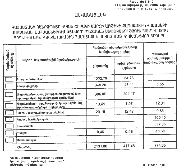 ա) Հայաստանի Հանրապետության Շիրակի մարզի Արթիկի քաղաքային համայնքին անհատույց սեփականության իրավունքով փոխանցվող 2131.86 հեկտար հողերից 417.45 հեկտարը մասնավորեցման ենթակա չէ.
