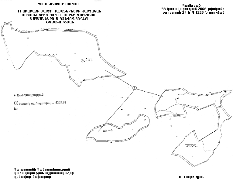 Հաստատել Հայաստանի Հանրապետության Արարատի մարզի համայնքների վարչական սահմաններից դուրս` մարզի վարչական սահմաններում գտնվող հողերի օգտագործման ժամանակավոր սխեման` համաձայն հավելվածի, և պետական սեփականություն հանդիսացող` գյուղատնտեսական նշանակության 5329.91 հեկտար հողերը փոխադրել հատուկ պահպանվող տարածքների հողերի կատեգորիա` որպես բնապահպանական հողեր։