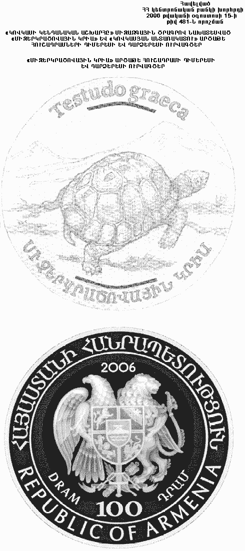1. Հաստատել «Կովկասի կենդանական աշխարհը» միջազգային ծրագրով նախատեսված «Միջերկրածովային կրիա» և «Կովկասյան անտառակատու» արծաթե հուշադրամների դիմերեսի և դարձերեսի ուրվագծերը՝ համաձայն հավելվածի (կցվում է):