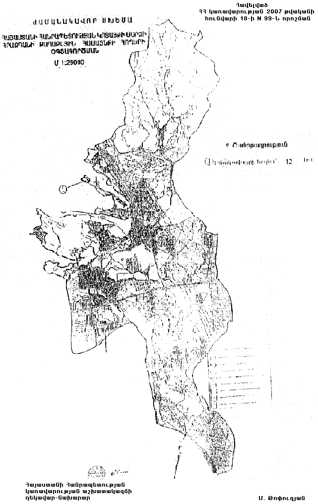 Հայաստանի Հանրապետության կառավարության 2005 թվականի դեկտեմբերի 29-ի N 2293-Ն որոշմամբ հաստատված` Հայաստանի Հանրապետության Կոտայքի մարզի Հրազդանի քաղաքային համայնքի հողերի օգտագործման ժամանակավոր սխեմայում` համաձայն հավելվածի, համայնքային սեփականություն հանդիսացող գյուղատնտեսական նշանակության հողերից 12 հեկտար արոտավայրերը փոխադրել բնակավայրերի հողերի կատեգորիա` հասարակական կառուցապատման համար: