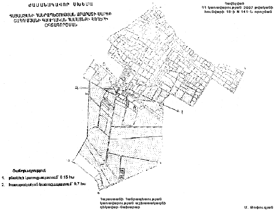 Հայաստանի Հանրապետության կառավարության 2001 թվականի հունիսի 14-ի N 533 որոշմամբ հաստատված` Հայաստանի Հանրապետության Արարատի մարզի Շահումյանի գյուղական համայնքի հողերի օգտագործման ժամանակավոր սխեմայում` համաձայն հավելվածի, համայնքային սեփականություն հանդիսացող գյուղատնտեսական նշանակության հողերից 0.85 հեկտար վարելահողը փոխադրել բնակավայրերի հողերի կատեգորիա, որից` 0.15 հեկտարը` բնակելի կառուցապատման, 0.7 հեկտարը` հասարակական կառուցապատման համար: