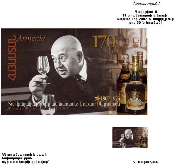 5) Հայկական կոնյակի տեխնոլոգ Մարգար Սեդրակյանի ծննդյան 100-ամյակին նվիրված «1907-1973 Հայ կոնյակագործության նահապետ Մարգար Սեդրակյան» նամականիշը, համաձայն N 6 հավելվածի.