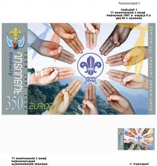 1) Եվրոպա. Սկաուտական շարժման 100-ամյակին նվիրված «EUROPA Սկաուտական շարժման 100-ամյակը» նամականիշը, համաձայն N 1 հավելվածի.