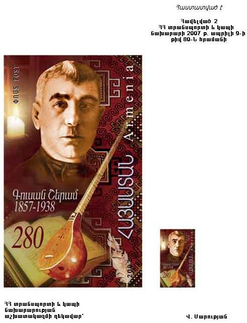 2) Գուսան Շերամի ծննդյան 150-ամյակին նվիրված «Գուսան Շերամ 1857-1938» նամականիշը, համաձայն N 2 հավելվածի.