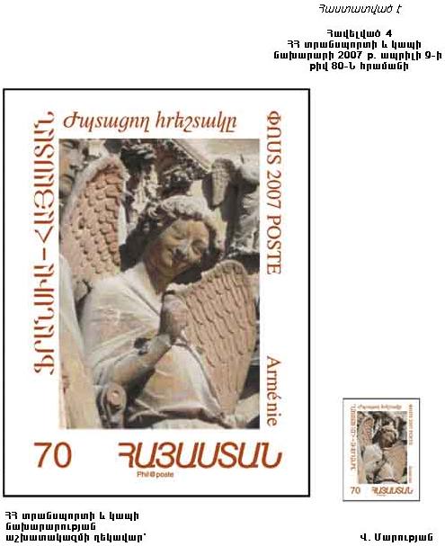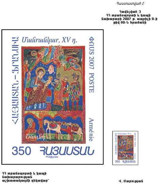 3) Համատեղ հայ-ֆրանսիական թողարկմանը նվիրված «ՀԱՅԱՍՏԱՆ-ՖՐԱՆՍԻԱ Մանրանկար, XV դ., Ծնունդ» և « ՖՐԱՆՍԻԱ-ՀԱՅԱՍՏԱՆ Ժպտացող հրեշտակը» երկու նամականիշը, համաձայն N 3 և N 4 հավելվածների.
