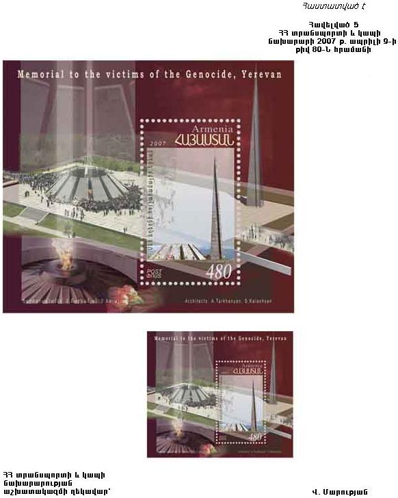 4) Հայկական ճարտարապետական հուշարձաններ. Մեծ եղեռնի հուշահամալիրին նվիրված «Memorial to the victims of the Genocide, Yerevan Մեծ եղեռնի հուշահամալիր, Երևան, Ճարտարապետներ` Ա. Թարխանյան, Ս. Քալաշյան» գեղաթերթիկը, համաձայն N 5 հավելվածի.
