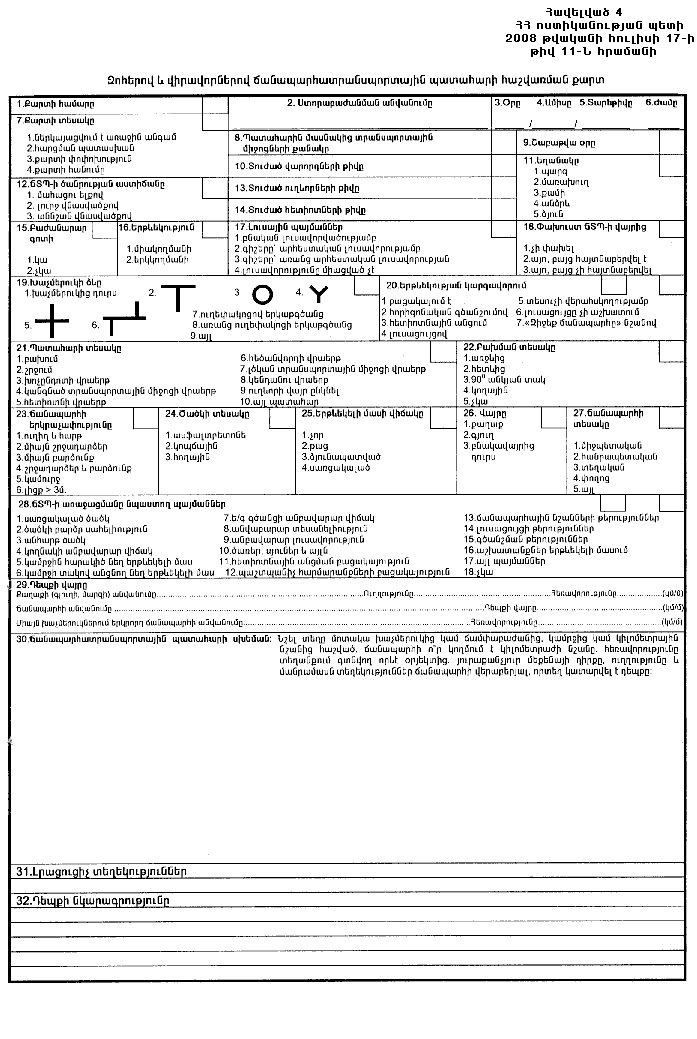 4) զոհերով և վիրավորներով ճանապարհատրանսպորտային պատահարի հաշվառման քարտի ձևը՝ համաձայն հավելված 4-ի,