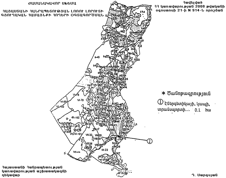1. Հայաստանի Հանրապետության կառավարության 2002 թվականի սեպտեմբերի 12-ի N 1448-Ն որոշմամբ հաստատված` Հայաստանի Հանրապետության Լոռու մարզի Լորուտի գյուղական համայնքի հողերի օգտագործման ժամանակավոր սխեմայում` համաձայն հավելվածի, համայնքային սեփականություն հանդիսացող` գյուղատնտեսական նշանակության այլ հողերից 0.1 հեկտարը փոխադրել էներգետիկայի, տրանսպորտի, կապի և կոմունալ ենթակառուցվածքների օբյեկտների հողերի կատեգորիա` փոքր հիդրոէլեկտրակայանի և օժանդակ կառույցների շինարարության համար: